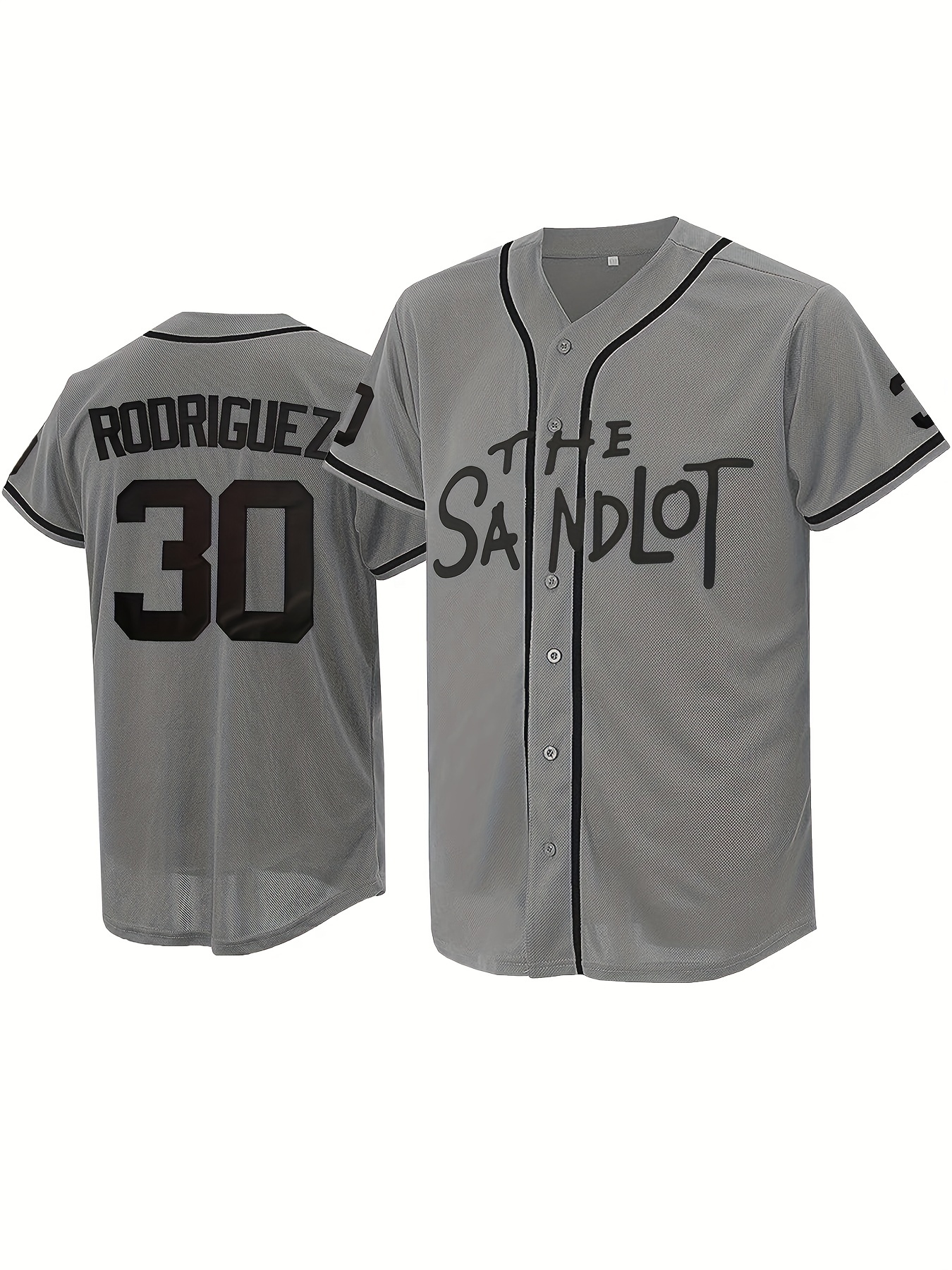 Men's #30 Baseball Jersey - Grey Embroidered "RODRIGUEZ" & "THE SANDLOT" V-Neck Button-Up Sweatshirt, Loose Fit All-Season Casual Sports Top for Training, Parties & Streetwear