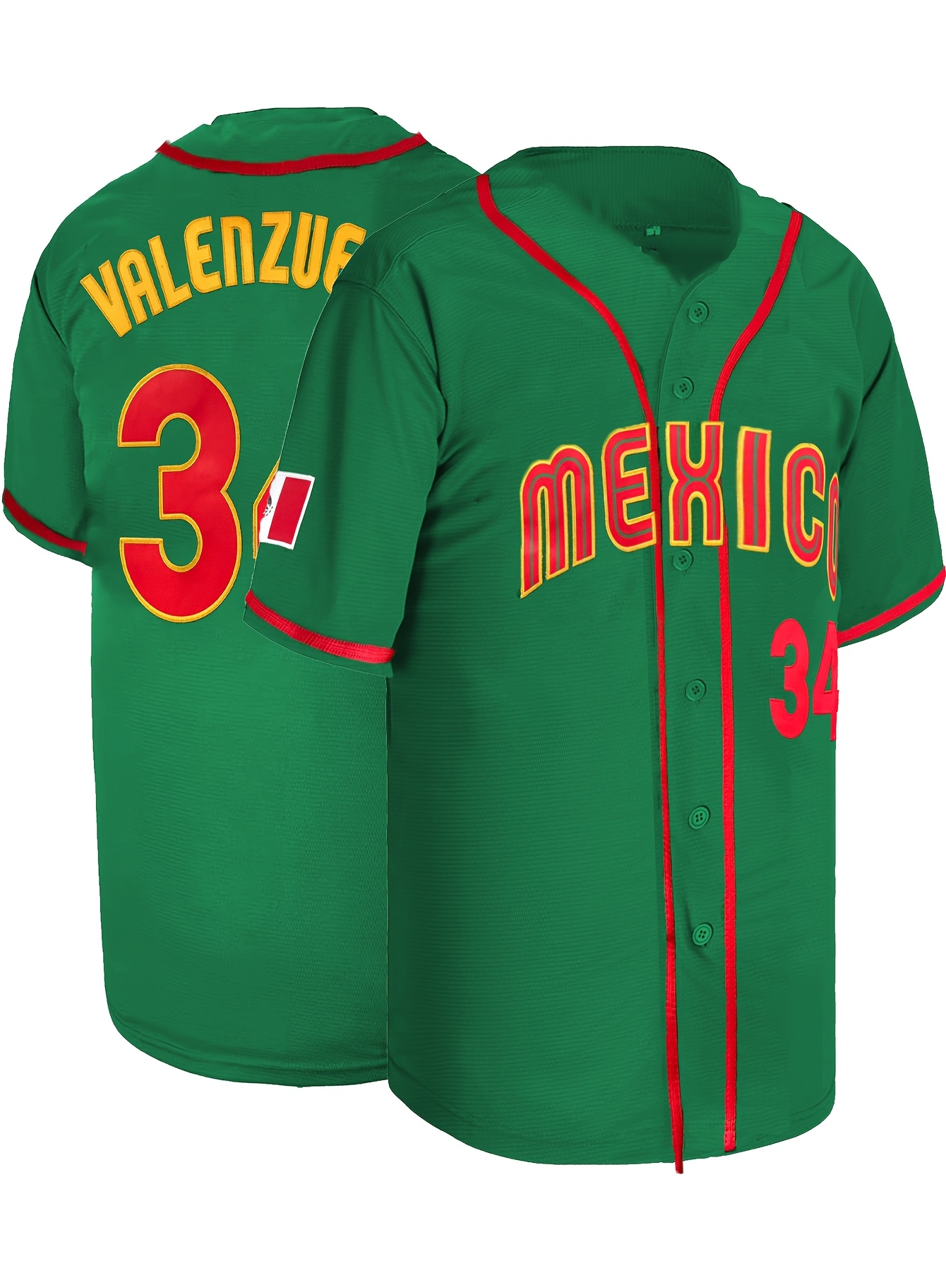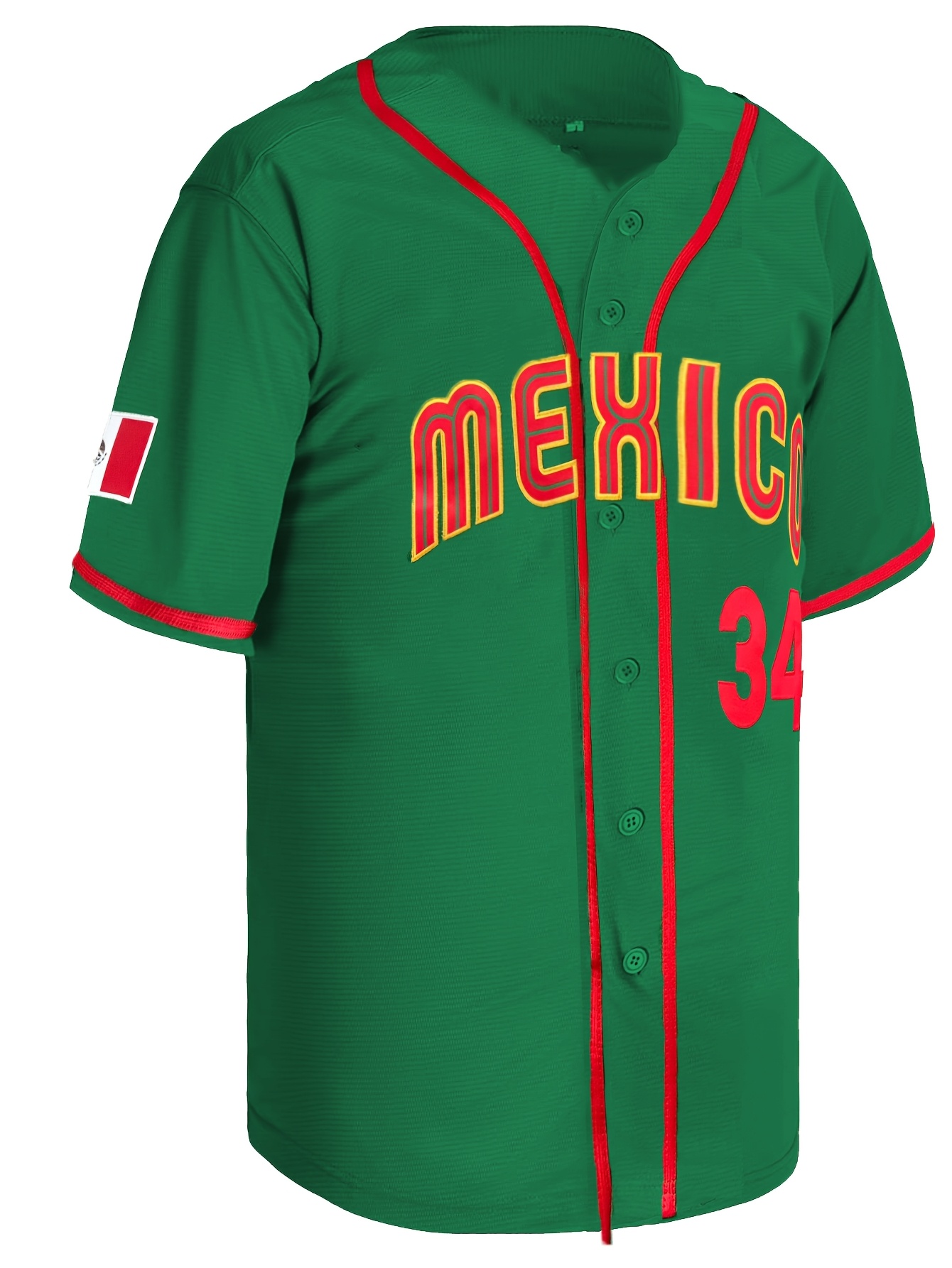 Men's #34 Mexico-Inspired Green Baseball Jersey with Red Letter Embroidery - V-Neck, Short Sleeve, Breathable Polyester, Button-Up Sports Uniform for Training, Competition & Casual Wear