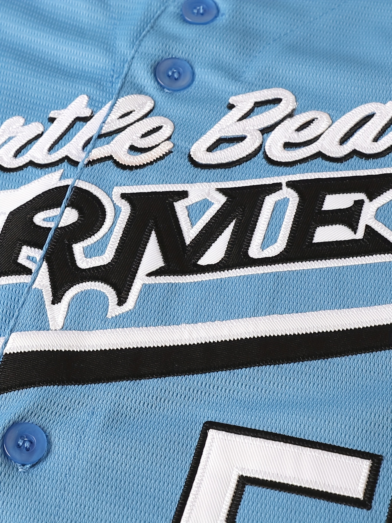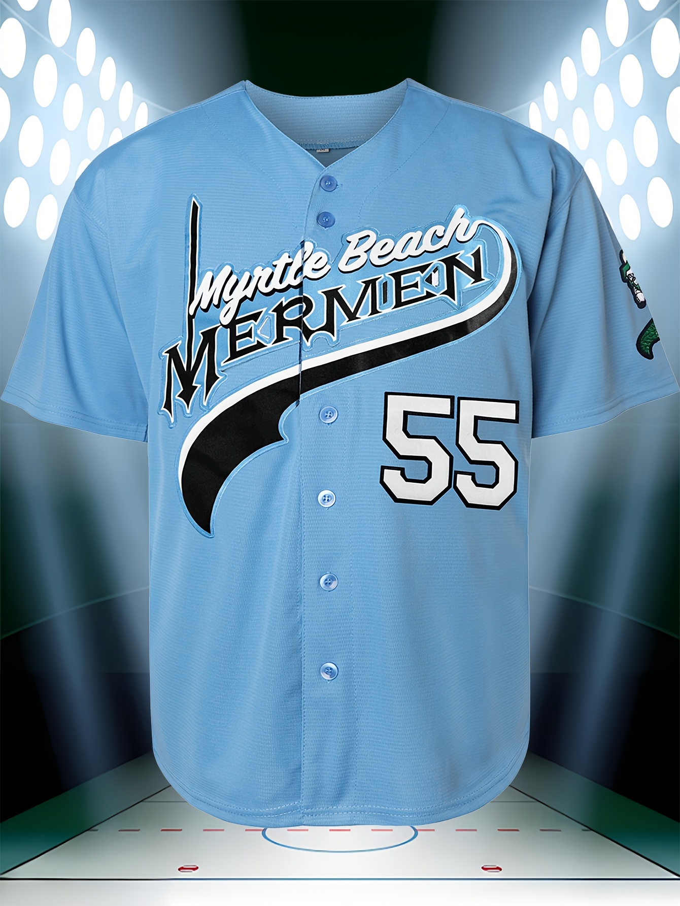 Men's #55 Blue Baseball Jersey - Embroidered V-Neck, Retro Mets Design with "MYTLE BEACH MERMAID" Print, Loose Fit for Casual & Outdoor Wear, Sizes X-XXXL, Sports Casual Wear | Casual Sports Apparel | Embroidered Sports Jersey