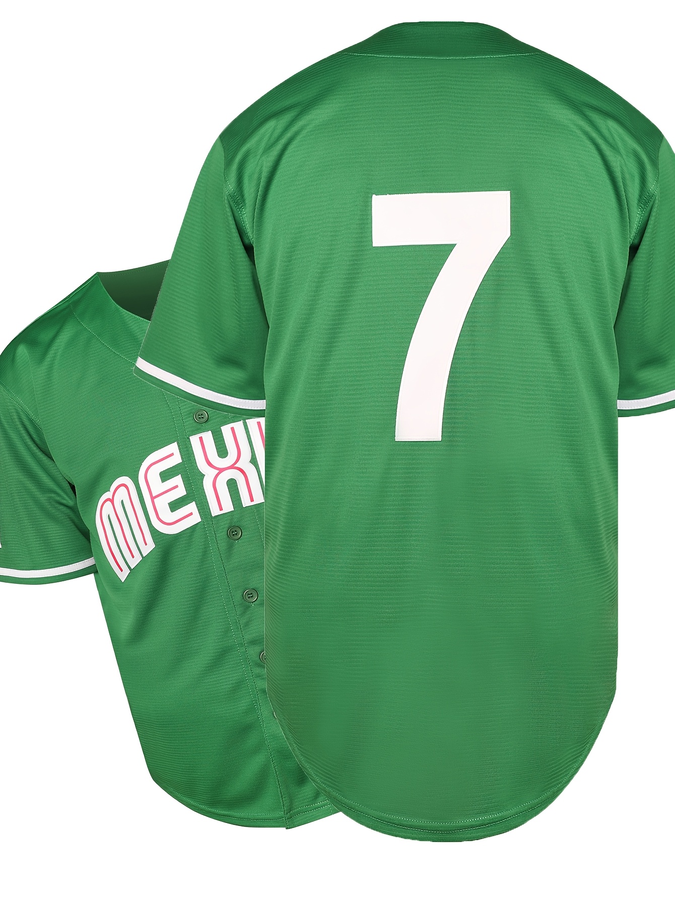 Stitched #7 Green Baseball Jersey Red Letter Embroidery V Neck Short Sleeve Baseball Shirt, Breathable Button-Up Sports Uniform For Training Competition Party