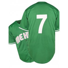 Stitched #7 Green Baseball Jersey Red Letter Embroidery V Neck Short Sleeve Baseball Shirt, Breathable Button-Up Sports Uniform For Training Competition Party