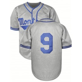 Stitched #9 Grey Baseball Jersey Red Letter Embroidery V Neck Short Sleeve Baseball Shirt, Breathable Button-Up Sports Uniform For Training Competition Party