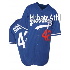 Blue 42 Baseball Jersey All Stitched Embroidery V Neck Short Sleeve Baseball Shirt, Breathable Button-Up Sports Uniform For Training Competition Party