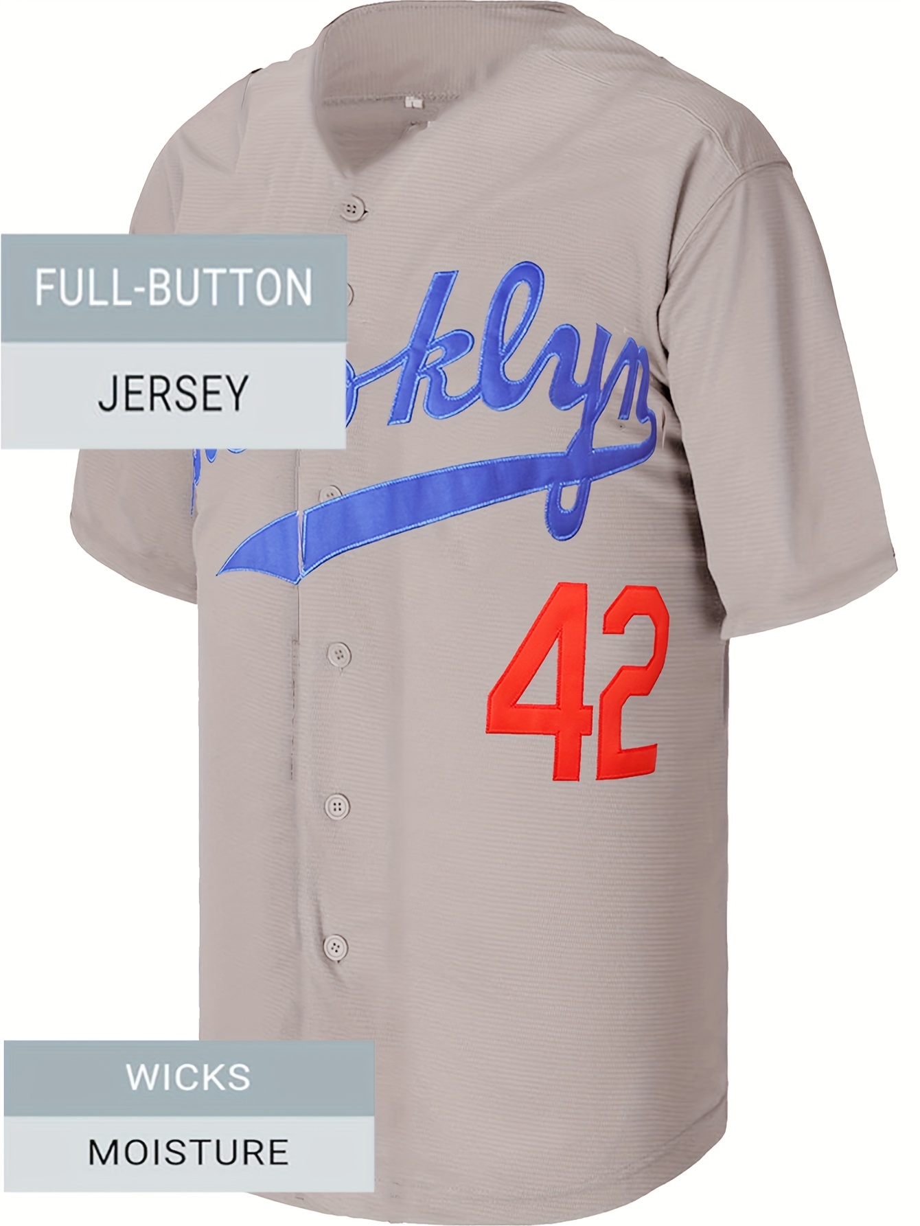 42 Grey Baseball Jersey All Stitched EMbroidery V Neck Short Sleeve Baseball Shirt, Breathable Button-Up Sports Uniform For Training Competition Party