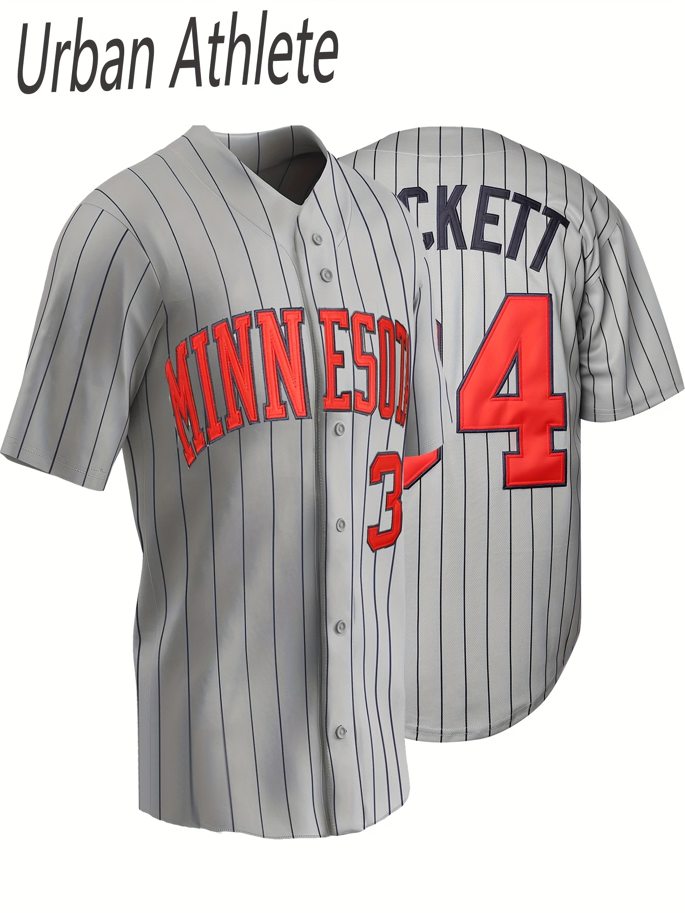 Minnesota Baseball Jersey #34 - Grey Stripe V-Neck Short Sleeve Button-Up Shirt with Full Embroidery, Breathable Fabric for Training, Competition & Casual Wear (Adults & Youths), Athletic Clothing | Sporty Aesthetic | Embroidered Detailing